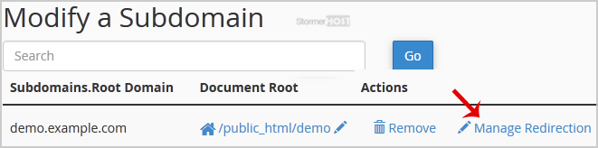 4. Click the Manage Redirection link that corresponds to the subdomain that you wish to manage.
